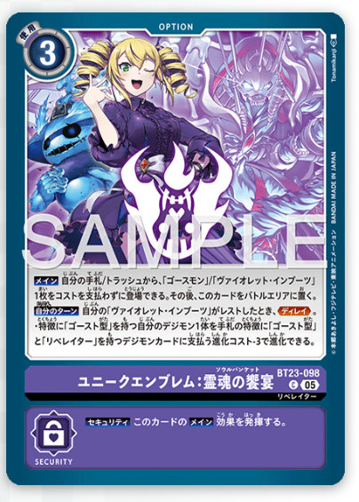 [Main] You may play 1 [Ghostmon] or [Violet Inboots] from your hand or trash without paying the cost. Then, place this card in the battle area.