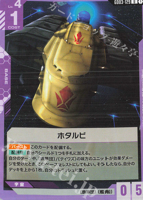 During your turn, when one of your friendly (Tekkadan)/(Teiwaz) Units receives effect damage, you may rest this Base. If you do, place the top card of your deck into your trash.