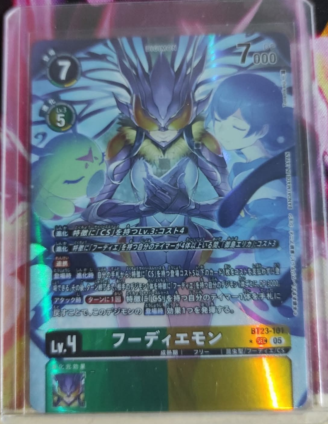 [On Play] [When Digivolving] You may play 1 play cost 5 or lower [CS] trait card from your hand without paying the cost. Then, to 1 of your opponent’s Digimon, give -3000 DP for the turn for each of your [Hudie] trait Digimon.