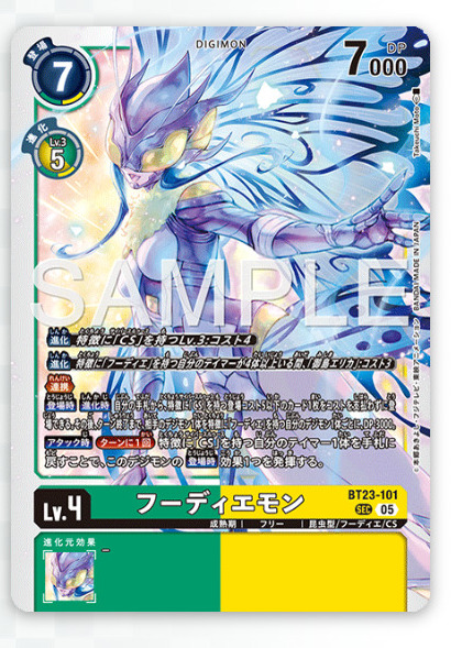[On Play] [When Digivolving] You may play 1 play cost 5 or lower [CS] trait card from your hand without paying the cost. Then, to 1 of your opponent’s Digimon, give -3000 DP for the turn for each of your [Hudie] trait Digimon.